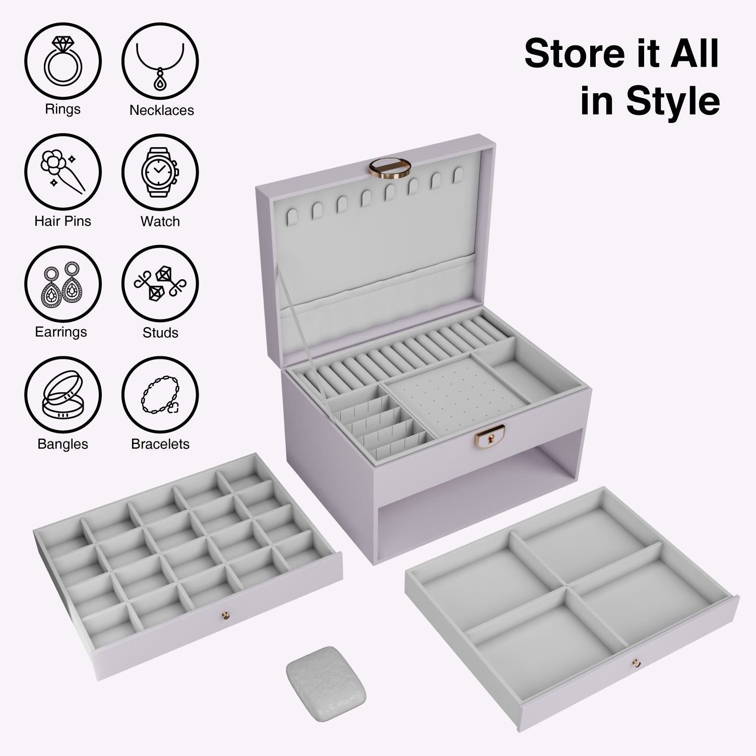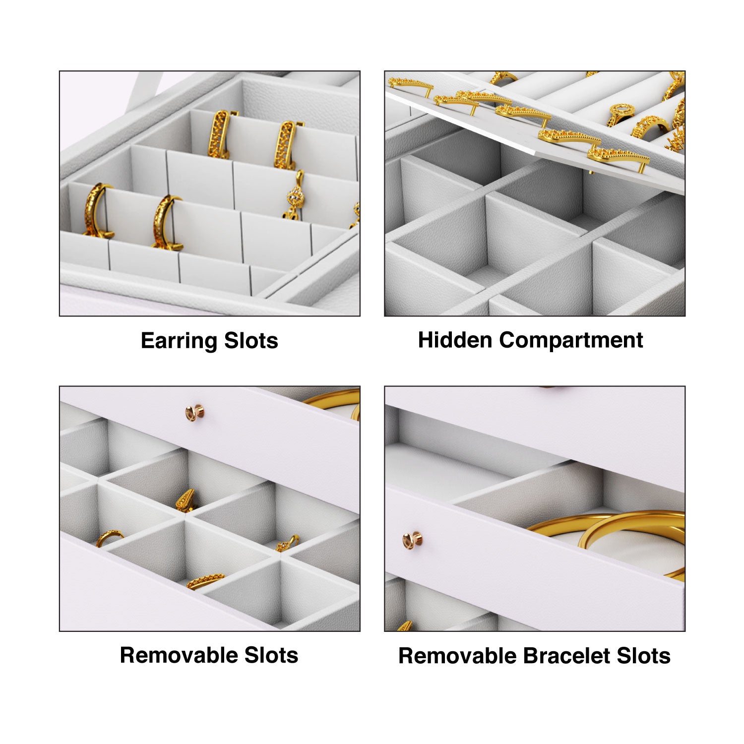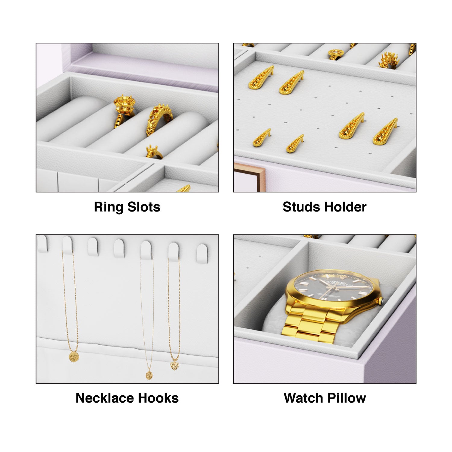 White jewellery box with a premium leather finish and velvet lining. Features necklace hooks, ring slots, removable and adjustable compartments, a hidden section, and a watch pillow for convenient organization.